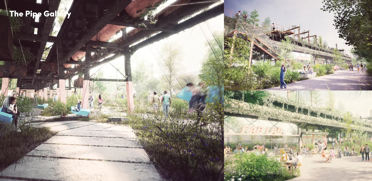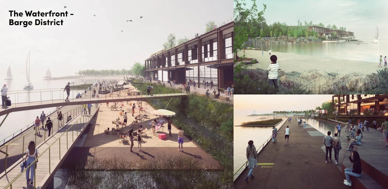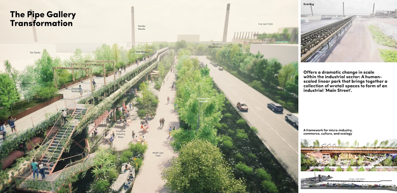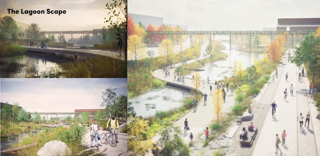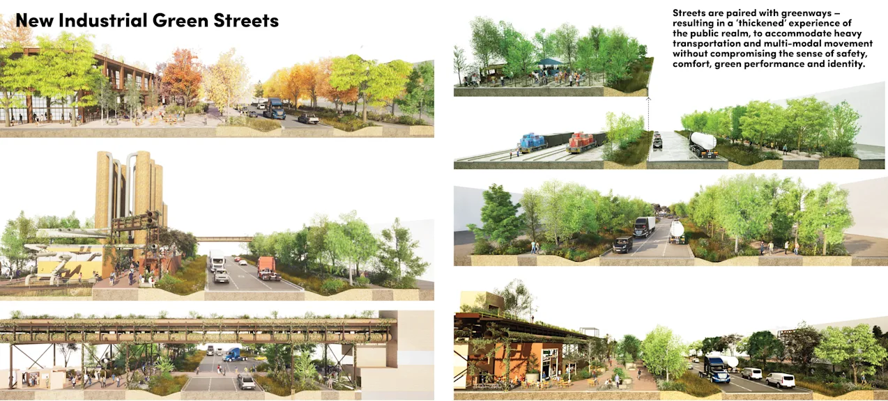 The public realm framework introduces immersive new experiences across this vast landscape, shaped by a dialogue between industrial heritage, nature, contemporary amenity, and ongoing production. This framework culminates in renewed public access to the waterfront along the north shoreline. An integrated network of public realm elements—including water systems, preserved industrial remnants, streets and greenways, amenitized open spaces, and ecological corridors—provides the foundation for a transformed experience of place that honours the site’s past while seeding new life for an evolving future.