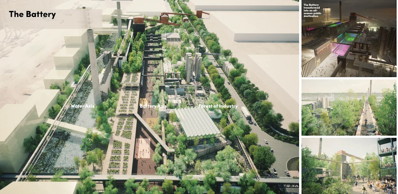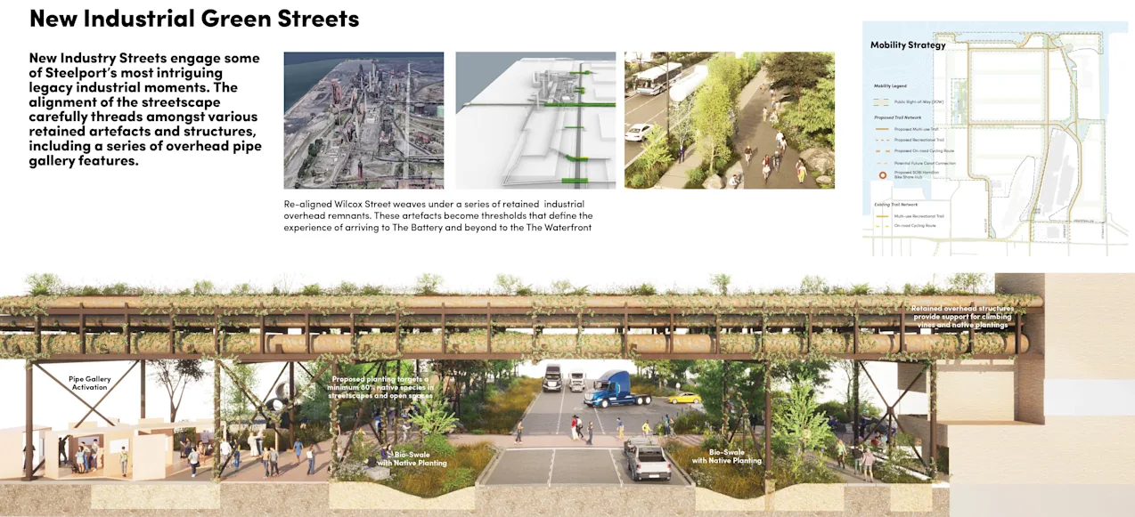 A collection of the site’s most iconic features is anchored by new public amenities, creating four distinct and memorable open-space destinations. These districts form the core public figure of the site, each blending water, industrial remnants, and contemporary programming in a unique way. Their arrangement enables a continuous loop that unites these destinations within a cohesive network, supported by streets and greenways that reconnect the site to the city’s broader mobility framework. The Steelport Loop establishes an ambitious model for hybrid partnerships, supporting long-term activation, stewardship, and operational success. At the heart of the site, the strategic preservation of Stelco’s monumental Coke Battery Plant structures defines a new form of hybrid park—bringing together old and new to catalyze future innovation, cultural production, and economic vitality.