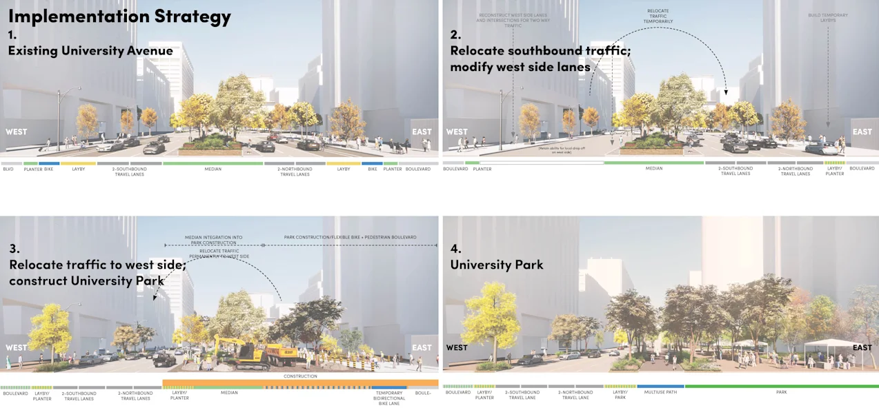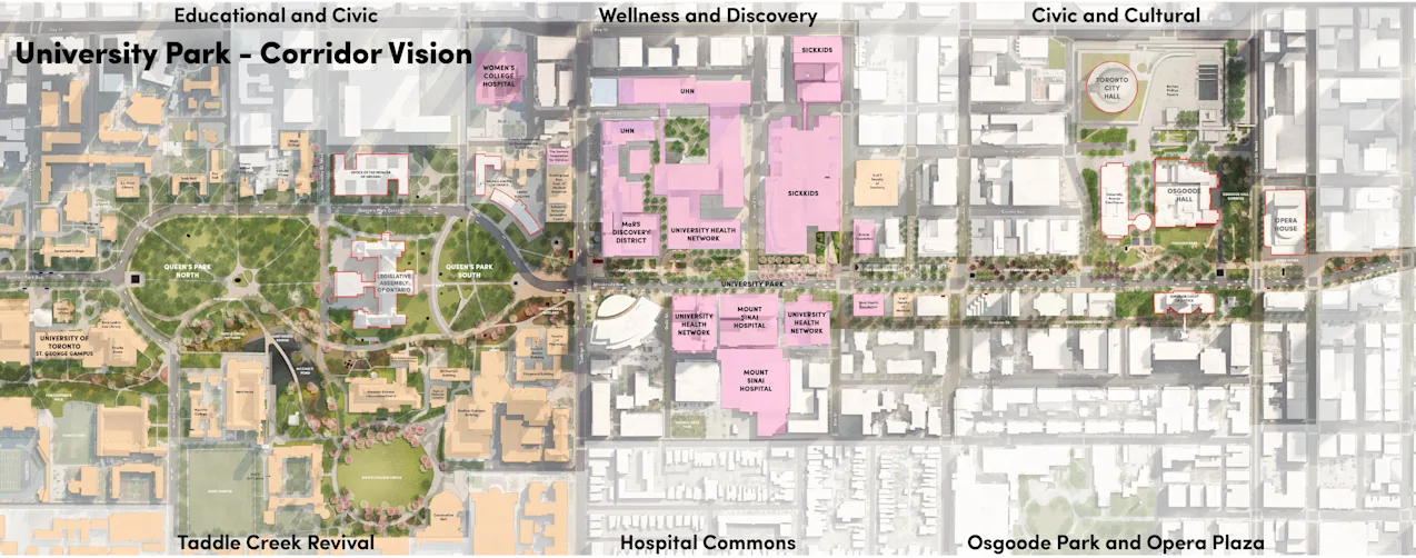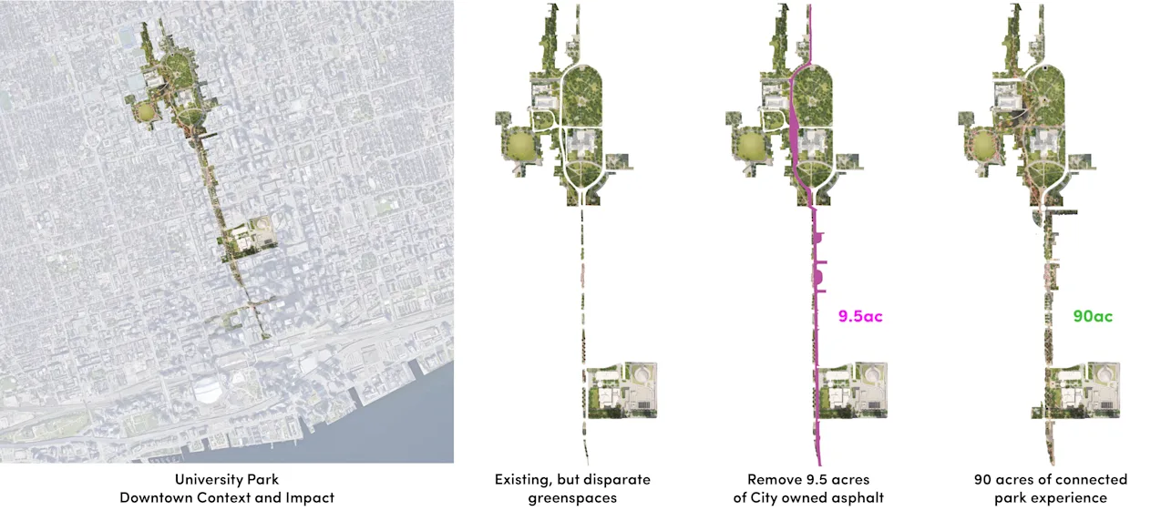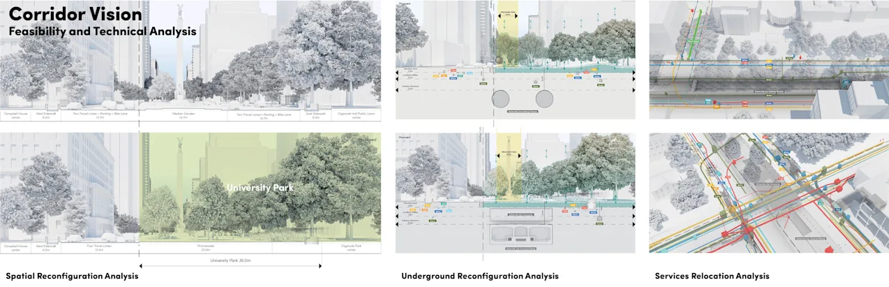 The core project team is working closely with the City of Toronto, local institutions, and community stakeholders to bring this transformative vision to life. Public life surveys are shaping a detailed understanding of how the existing space performs, and traffic modelling and access analyses will confirm the feasibility of proposed network changes to the street. University Park is poised to become Toronto’s next great civic space—an ambitious and inspiring public realm that brings nature to the city to enrich the environment, strengthen community life, and energize downtown for generations to come.